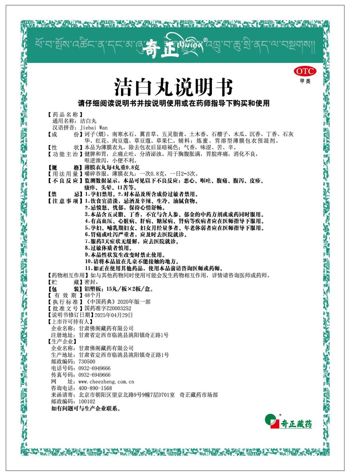 甘肅佛閣藏藥有限公司按照潔白丸(每4丸重0.8g)獲批的國家藥品監(jiān)督管理局藥品補充申請通知書內(nèi)容,對潔白丸(每4丸重0.8g)藥品說明書中的【不良反應】、【禁忌】和【注意事項】進行了修訂及備案,現(xiàn)將新版說明書予以發(fā)布,如您需要更為詳細的信息或有特定的問題,可以聯(lián)系客服400-890-1568或撥打企業(yè)電話:0932-6949666。